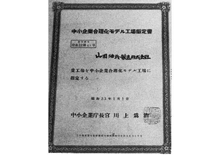 中小企業庁長官より中小企業合理化モデル工場の指定を受ける